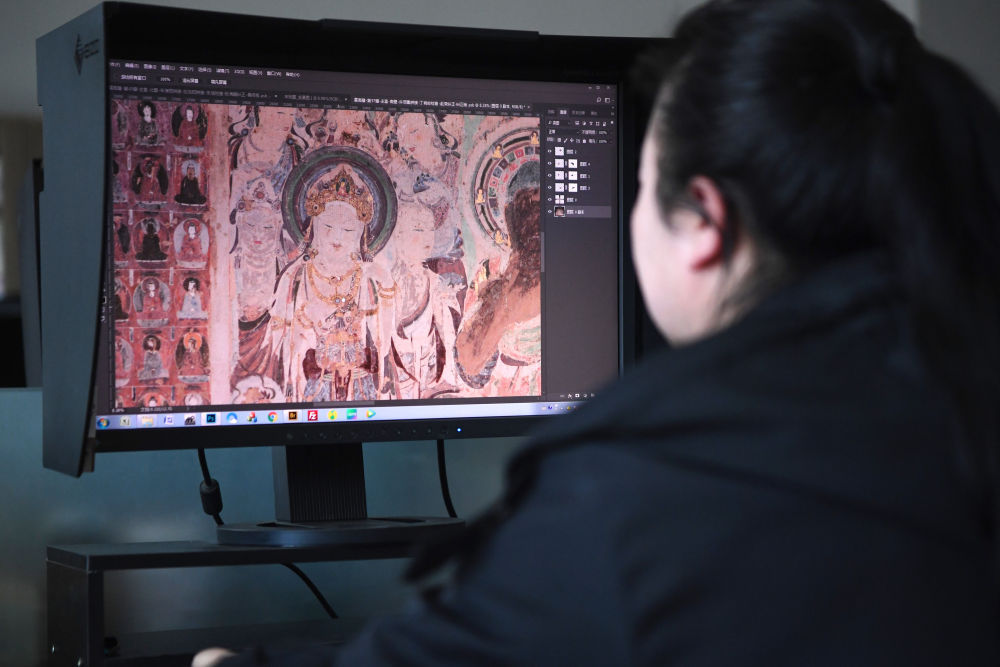 敦煌研究院文物数字化?;ね哦油枷翊砣嗽蹦旰@鲈谄唇颖诨枷瘢?023年4月25日摄)。数字化探索为莫高窟的?;び氪锌倭巳侣肪叮旨际跞枚鼗臀奈镒叱龆纯?,跨出国门,走向“永久保存、永续利用”。新华社记者 陈斌 摄